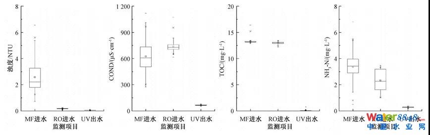 統(tǒng)計(jì)2019全年運(yùn)行雙膜系統(tǒng)進(jìn)水及雙膜系統(tǒng)凈化,經(jīng)紫外消毒后的出水指標(biāo),如圖3所示。微濾系統(tǒng)主要對(duì)濁度有明顯的去除效果,濁度從微濾系統(tǒng)進(jìn)水的(2.58±1.02) NTU降至出水平均值(0.17±0.03) NTU,去除率達(dá)到93.4%。微濾系統(tǒng)對(duì)總有機(jī)碳(TOC)無(wú)明顯去除作用。NH3-N通過(guò)微濾系統(tǒng)后有一定程度降低,從微濾系統(tǒng)進(jìn)水的(3.38±0.84) mg/L降至(2.33±0.77) mg/L。