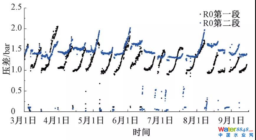 反滲透系統(tǒng)連續(xù)運(yùn)行時(shí),可根據(jù)不同的原水水質(zhì),通過(guò)調(diào)節(jié)二段反滲透進(jìn)水阻力以限制輸送至二段反滲透系統(tǒng)的流量,提升一段回收率,調(diào)整系統(tǒng)總體運(yùn)行狀態(tài)。反滲透進(jìn)水高壓泵維持在6.5 bar左右運(yùn)行,統(tǒng)計(jì)2019年6至9月反滲透系統(tǒng)一段、二段相對(duì)壓差值(即進(jìn)水與濃水之間壓差)隨運(yùn)行時(shí)間的變化情況,如圖5所示。