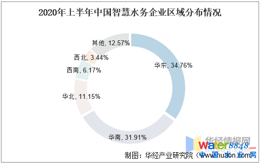 從企業(yè)區(qū)域分布情況來看,地域性特點突出。據(jù)統(tǒng)計,2020年上半年我國智慧水務相關業(yè)務的地域性特點較為突出,行業(yè)企業(yè)主要分布在華南地區(qū)以及華東地區(qū),占比約67%。我國智慧水務行業(yè)區(qū)域性發(fā)展特征與地區(qū)經(jīng)濟發(fā)展水平與信息技術發(fā)展水平等息息相關。