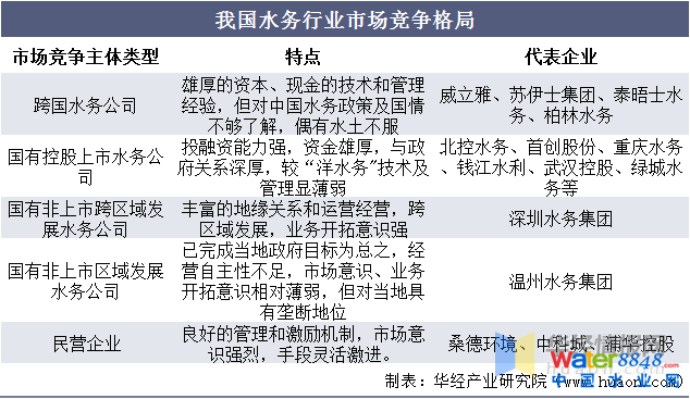 從國內(nèi)市場競爭格局來看,行業(yè)集中度偏低且經(jīng)營分散。十六屆三中全會明確了包括城市水業(yè)在內(nèi)的壟斷性行業(yè)的市場準入,水務行業(yè)市場化改革加速,鼓勵社會資本進入,因此國外水務巨頭紛紛涌入我國,隨著國家政資分離,國內(nèi)水務企業(yè)紛紛改組,民營資本、上市公司紛紛加入水務市場。因此世界水務巨頭、大型水務專業(yè)投資公司(國有或民營)、非水務類的投資集團(國有或民營)、水務類上市公司、地方性的水務公司將逐漸成為主導我國水務市場的投資力量。市場競爭使原有的區(qū)域壟斷特征弱化,少數(shù)資本雄厚、品牌影響力突出、綜合競爭力強的企業(yè)通過并購整合進行跨地區(qū)、跨市場競爭,成為我國大型水務企業(yè)規(guī);l(fā)展的新契機。