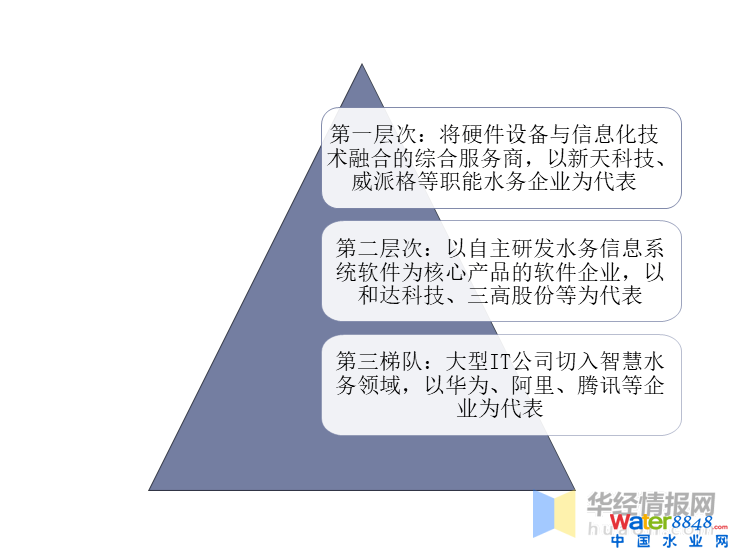 在企業(yè)競爭方面,目前,中國智慧水務行業(yè)的企業(yè)主要分為三個類型:一類是以儀器儀表和自動供水設備等水務信息化硬件產(chǎn)品為核心產(chǎn)品及主要收入來源的設備生產(chǎn)商,通過設備與信息化技術融合為水務企業(yè)客戶提供水務信息化服務,這類企業(yè)以上市公司新天科技、威派格為代表。