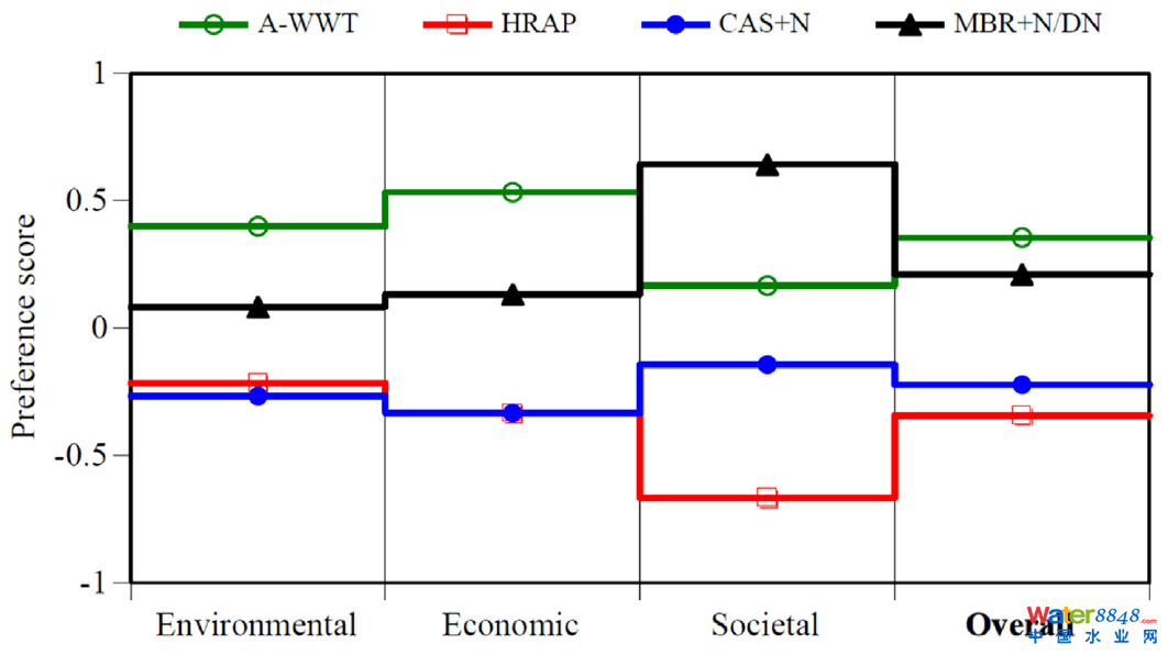 由圖2所示,在環(huán)境可持續(xù)性方面,上述四種污水處理技術(shù)按照A-WWT(0.4)、MBR(0.08)、HRAP(-0.22)和CAS(-0.27)的順序從最好到最差。在經(jīng)濟(jì)可持續(xù)性的背景下,A-WWT和MBR技術(shù)獲得了正的偏好分?jǐn)?shù),且A-WWT系統(tǒng)的排名優(yōu)于MBR系統(tǒng)。而HRAP和CAS系統(tǒng)的偏好分?jǐn)?shù)為負(fù),且HRAP優(yōu)于CAS。在社會(huì)可持續(xù)性方面,MBR、A-WWT、CAS、HRAP分別得分0.64、0.17、-0.14和-0.67,排名順序從最好到最差。考慮整體可持續(xù)性,四種處理技術(shù)由最好到最差分別為A-WWT、MBR、CAS和HRAP。