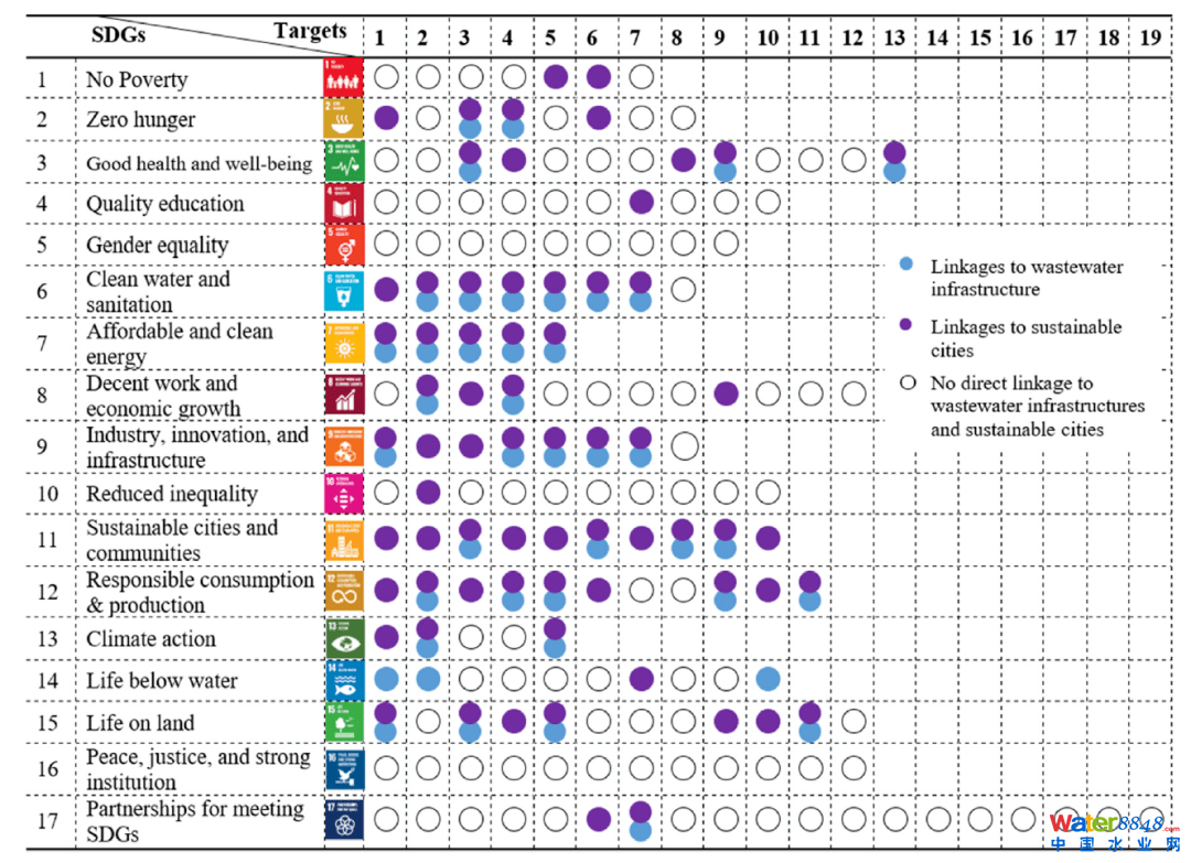 污水基礎(chǔ)設(shè)施的主要目標(biāo)是通過(guò)收集和末端處理污水以滿足排放標(biāo)準(zhǔn)來(lái)提供衛(wèi)生設(shè)施和保護(hù)生態(tài)系統(tǒng)。在2030年議程的背景下,傳統(tǒng)的污水基礎(chǔ)設(shè)施無(wú)法滿足許多可持續(xù)發(fā)展目標(biāo)(SDG),例如SDG #6——“清潔飲水和衛(wèi)生設(shè)施”,旨在確保所有人都能獲得和可持續(xù)管理水和衛(wèi)生設(shè)施。通常,為污水基礎(chǔ)設(shè)施選擇合適的技術(shù)完全基于經(jīng)濟(jì)和環(huán)境考慮,而很少考慮社會(huì)方面。盡管部分研究在評(píng)估中同時(shí)考慮了這三個(gè)方面的可持續(xù)性問(wèn)題,很少有研究明確地將其與 17 個(gè)SDG和 169 個(gè)具體目標(biāo)相聯(lián)系。