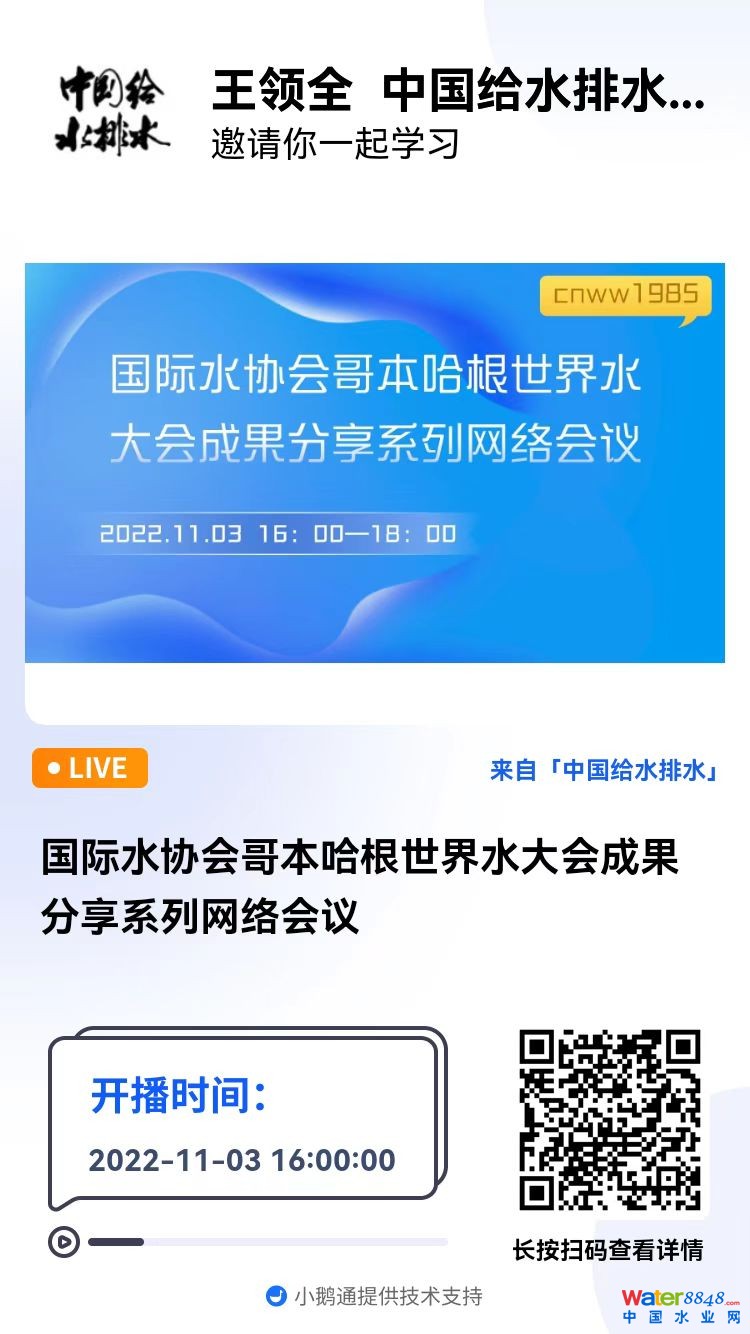 國際水協(xié)會(huì)哥本哈根世界水大會(huì)成果分享系列網(wǎng)絡(luò)會(huì)議 直播時(shí)間:2022年11月3日 16:00—18:00 2022-11-03 16:00:00 開始