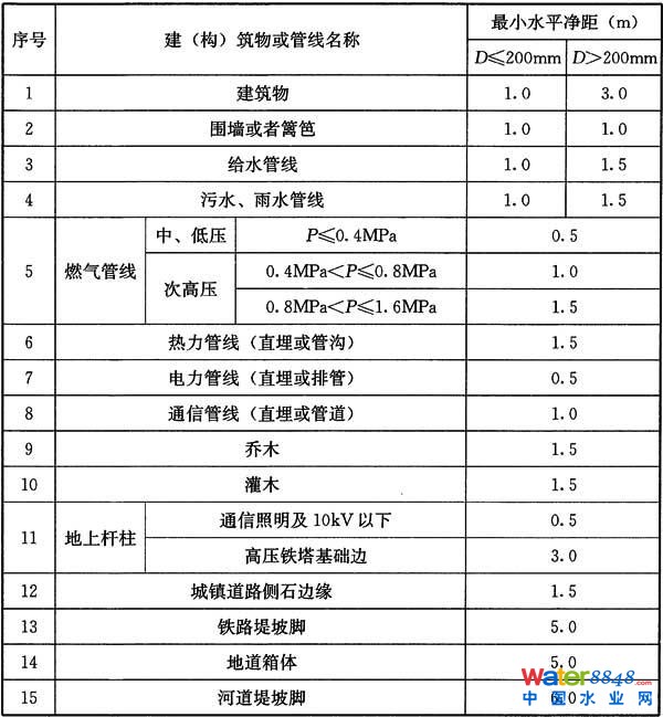 6.1.6 再生水管道與建(構)筑物、鐵路以及其他工程管道之間的最小水平凈距,應按本規(guī)范附錄A的規(guī)定確定。