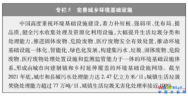持續(xù)打好污染防治攻堅(jiān)戰(zhàn)。環(huán)境就是民生,青山就是美麗,藍(lán)天也是幸福。中國(guó)堅(jiān)持精準(zhǔn)治污、科學(xué)治污、依法治污,以解決人民群眾反映強(qiáng)烈的大氣、水、土壤污染等突出問(wèn)題為重點(diǎn),持續(xù)打好藍(lán)天、碧水、凈土保衛(wèi)戰(zhàn)。區(qū)域聯(lián)防聯(lián)控和重污染天氣應(yīng)對(duì)成效顯著,全國(guó)地級(jí)及以上城市細(xì)顆粒物(PM2.5)年均濃度由2015年的46微克/立方米降至2021年的30微克/立方米,空氣質(zhì)量?jī)?yōu)良天數(shù)比例達(dá)到87.5%,成為全球大氣質(zhì)量改善速度最快的國(guó)家。工業(yè)、農(nóng)業(yè)、生活污染源和水生態(tài)系統(tǒng)整治加快推進(jìn),飲用水安全得到有效保障,污染嚴(yán)重水體和不達(dá)標(biāo)水體顯著減少,2021年全國(guó)地表水水質(zhì)優(yōu)良斷面比例達(dá)到84.9%。全面禁止洋垃圾入境,實(shí)現(xiàn)固體廢物“零進(jìn)口”目標(biāo),土壤環(huán)境風(fēng)險(xiǎn)得到基本管控。藍(lán)天白云、繁星閃爍,清水綠岸、魚(yú)翔淺底,人們呼吸的空氣更清新、喝的水更干凈、吃的食物更放心、生活的環(huán)境更優(yōu)美,切實(shí)感受到生態(tài)環(huán)境變化帶來(lái)的幸福和美好。