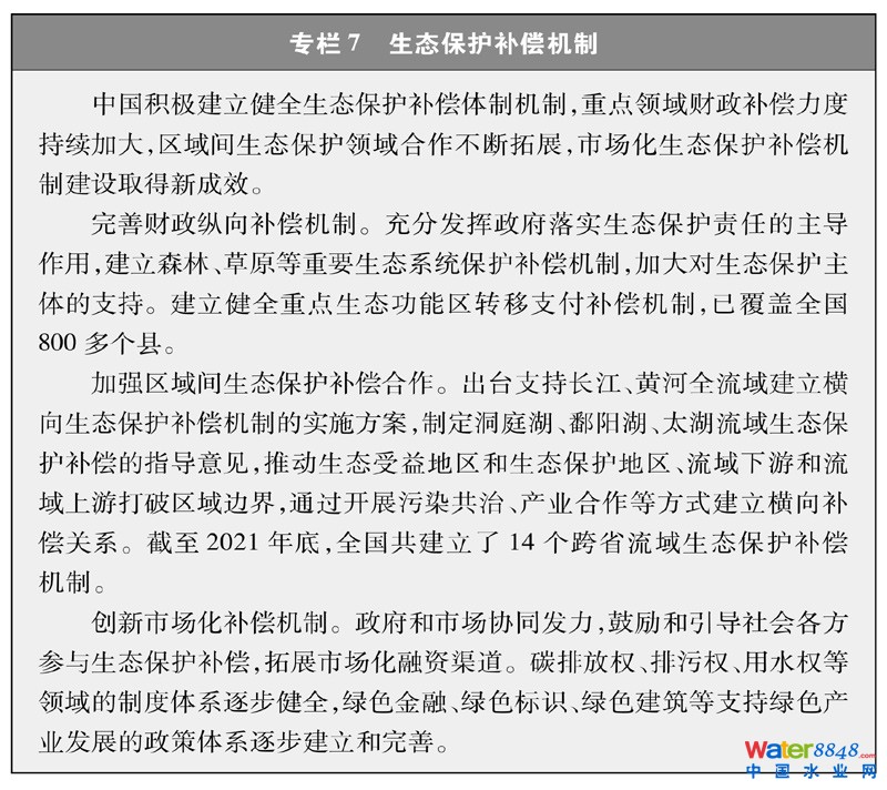 中國(guó)逐步建立完善政府有力主導(dǎo)、企業(yè)積極參與、市場(chǎng)有效調(diào)節(jié)的體制機(jī)制,更好激發(fā)全社會(huì)參與綠色發(fā)展的積極性。創(chuàng)新和完善節(jié)水節(jié)能、污水垃圾處理、大氣污染治理等重點(diǎn)領(lǐng)域的價(jià)格形成機(jī)制,實(shí)施50余項(xiàng)稅費(fèi)優(yōu)惠政策,引導(dǎo)優(yōu)化資源配置,支持促進(jìn)資源節(jié)約和高效利用,推動(dòng)綠色產(chǎn)業(yè)發(fā)展。建立統(tǒng)一的自然資源確權(quán)登記制度,在森林、草原、濕地、荒漠、水流、耕地等領(lǐng)域建立生態(tài)保護(hù)補(bǔ)償機(jī)制。探索建立生態(tài)產(chǎn)品價(jià)值實(shí)現(xiàn)機(jī)制,鼓勵(lì)支持社會(huì)資本參與生態(tài)保護(hù)修復(fù)。在科學(xué)合理控制總量的前提下,建立用水權(quán)、用能權(quán)、排污權(quán)、碳排放權(quán)初始分配和交易制度,開(kāi)展全國(guó)碳排放權(quán)交易市場(chǎng)建設(shè)和綠色電力交易試點(diǎn)建設(shè),進(jìn)一步發(fā)揮市場(chǎng)在生態(tài)環(huán)境資源配置中的基礎(chǔ)性作用。大力發(fā)展綠色金融,形成綠色信貸、綠色債券、綠色保險(xiǎn)、綠色基金、綠色信托等多層次綠色金融產(chǎn)品和市場(chǎng)體系。截至2021年末,中國(guó)本外幣綠色信貸余額15.9萬(wàn)億元,綠色債券存量余額超過(guò)1.1萬(wàn)億元,規(guī)模均居全球前列。