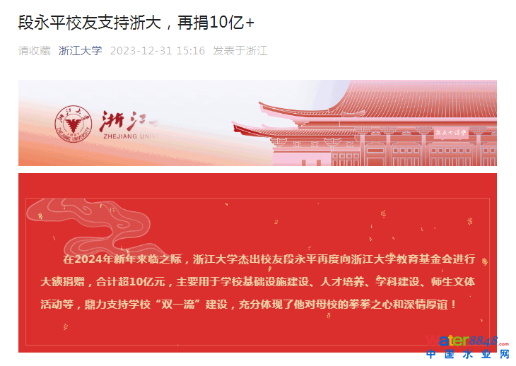 在2024年新年來(lái)臨之際,浙江大學(xué)杰出校友段永平再度向浙江大學(xué)教育基金會(huì)進(jìn)行大額捐贈(zèng),合計(jì)超10億元,主要用于學(xué);A(chǔ)設(shè)施建設(shè)、人才培養(yǎng)、學(xué)科建設(shè)、師生文體活動(dòng)等,鼎力支持學(xué)校“雙一流”建設(shè),充分體現(xiàn)了他對(duì)母校的拳拳之心和深情厚誼!