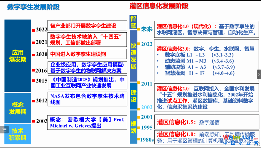 數(shù)字孿生灌區(qū)是智慧水利建設(shè)的重要組成部分,是現(xiàn)代化灌區(qū)的重要標(biāo)志,也是新階段灌區(qū)高質(zhì)量發(fā)展的方向。“有了數(shù)字技術(shù)后,農(nóng)村供水發(fā)生了天翻地覆的變化”。王校長(zhǎng)的報(bào)告對(duì)我國(guó)灌區(qū)現(xiàn)代化建設(shè)的發(fā)展階段、現(xiàn)階段的核心特征與挑戰(zhàn)、應(yīng)用實(shí)踐進(jìn)行了全面的介紹,并展望了灌區(qū)現(xiàn)代化發(fā)展藍(lán)圖。王校長(zhǎng)首先分析了我國(guó)灌區(qū)幾個(gè)發(fā)展階段的不同特征,和灌區(qū)管理經(jīng)歷的傳統(tǒng)管理、信息化管理和未來(lái)智慧化管理的幾個(gè)發(fā)展階段。針對(duì)現(xiàn)存的大中型灌區(qū)管理水平參差不齊,造成生產(chǎn)力低的問(wèn)題,王校長(zhǎng)從安全保障、農(nóng)業(yè)灌溉排水、管理與服務(wù)、效率與效益、生態(tài)環(huán)境五個(gè)方向給出了20個(gè)指標(biāo),指出以上方向中可賦能智慧的環(huán)節(jié)都是數(shù)字孿生能解決的問(wèn)題。
