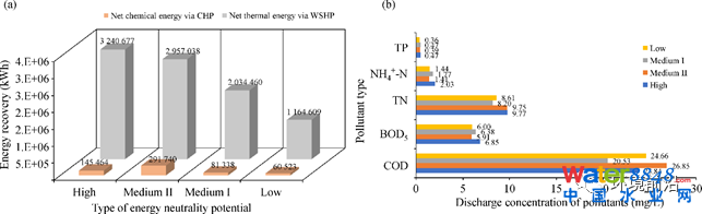 如圖3(a)所示,ENP高的污水處理廠熱能(WSHP)回收率最高,但ENP較高的污水處理廠回收的化學(xué)能(CHP)比例要小得多,說明我國污水廠熱能回收力遠(yuǎn)遠(yuǎn)高于化學(xué)能的回收。圖3(b)顯示的是污水廠的排污情況,除COD外,ENP較高的污水處理廠中所有污染物均按照最低要求排放,故加強污染物去除仍然是污水處理廠的主要目標(biāo)。