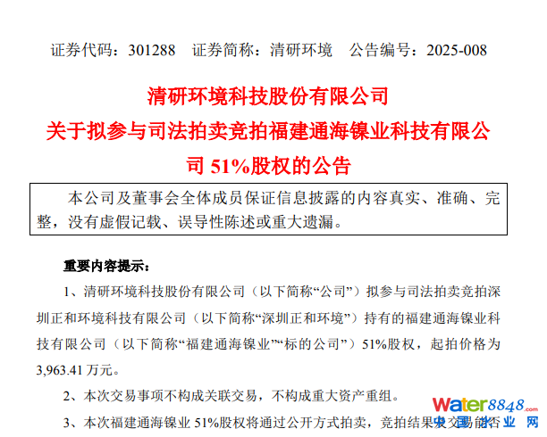 延伸至資源循環(huán)利用領(lǐng)域 清研環(huán)境擬參與競拍福建通海鎳業(yè)51%股權(quán)