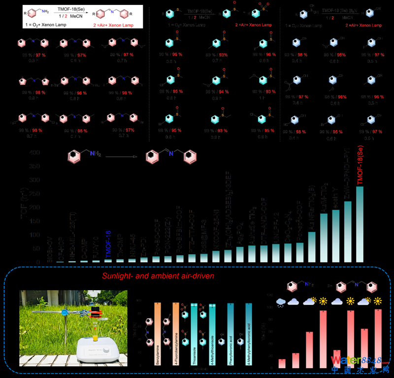 近日,化學(xué)科學(xué)與工程學(xué)院張弛教授和費(fèi)泓涵教授團(tuán)隊(duì)通過晶體工程方法構(gòu)建了一類具有電子供體-受體(D-A)效應(yīng)和原子級(jí)(O, S, Se)精準(zhǔn)修飾的鹵化鉛框架。該系列鹵化鉛材料由一維線性[PbCl]+鏈作為無機(jī)構(gòu)建單元,并采用苯并惡二唑、苯并噻二唑或苯并硒二唑功能化的羧酸分子作為配體支柱。帶有吸電子基團(tuán)的有機(jī)配體與富電子鹵化鉛單元之間形成了高效的共價(jià)鍵合,不僅有效促進(jìn)了電荷分離,還增強(qiáng)了本征結(jié)構(gòu)穩(wěn)定性。這項(xiàng)研究是首次將苯并惡二唑、苯并噻二唑或苯并硒二唑基團(tuán)與光活性鹵化鉛SBU配位協(xié)同作用的MOF應(yīng)用于光催化領(lǐng)域。該系列材料在C(sp3)-H鍵的活化、芐胺氧化偶聯(lián)、苯硼酸氧化和硫化物選擇性氧化等反應(yīng)中表現(xiàn)出定量產(chǎn)率,性能超過了此前報(bào)道的絕大部分金屬鹵化物和傳統(tǒng)MOF材料。更重要的是,這些光氧化反應(yīng)能夠由自然光和空氣環(huán)境驅(qū)動(dòng),無需任何添加劑,即可獲得定量產(chǎn)物。