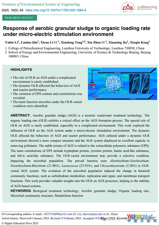 本文內(nèi)容來(lái)自FESE期刊2025年第19卷第5期發(fā)表的研究文章“Response of aerobic granular sludge to organic loading rate under micro-electric stimulation environment”。通訊作者為蘭州理工大學(xué)的趙霞副教授。