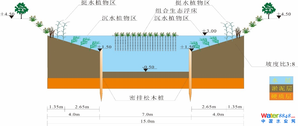 新型強化復(fù)合人工濕地工藝總停留時間3d,總水力負(fù)荷0.15m3/㎡/d,出水達(dá)到地表III類標(biāo)準(zhǔn)(GB3838-2002)。