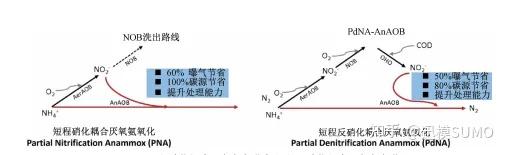 近些年來(lái),IFAS在國(guó)內(nèi)得到新發(fā)展,在活性污泥工藝的厭氧、缺氧區(qū)投加填料,是提升生化工藝脫氮效率新嘗試,國(guó)內(nèi)有多座市政污水廠運(yùn)行,在缺氧區(qū)投加懸浮載體形成的部分主流厭氧氨氧化現(xiàn)象在國(guó)內(nèi)多座污水廠被發(fā)現(xiàn),載體表面生物膜微生物菌群結(jié)構(gòu)的微觀解析發(fā)現(xiàn),Anammox具有較高的豐度,通過(guò)生物膜Anammox過(guò)程為生化段可提供大概20%~30%的總脫氮貢獻(xiàn);與此同時(shí),生物膜脫氮過(guò)程新的生化代謝機(jī)理被進(jìn)一步揭示,基于生物膜載體為基礎(chǔ)的Anammox脫氮過(guò)程兩種工藝路線,即短程硝化-厭氧氨氧化(Partial Nitritation-Anammox, PNA)、短程反硝化-厭氧氨氧化工藝路線(Partial denitrification-Anammox, PdNA)工藝被研究和提出,即“AM-AAO”工藝構(gòu)型、PdNA-MBBR或PdNA-IFAS,這些技術(shù)路線在國(guó)內(nèi)外一些項(xiàng)目被研究、應(yīng)用和示范-。PN-A工藝主要優(yōu)勢(shì)是無(wú)需外加碳源,理論上節(jié)省60%曝氣能耗,但影響工藝運(yùn)行穩(wěn)定性的主要因素在于短程硝化的過(guò)程控制,即亞硝酸鹽的穩(wěn)定產(chǎn)生過(guò)程,其在主流城市污水處理中難以長(zhǎng)期維持穩(wěn)定的關(guān)鍵問(wèn)題仍有待解決;而PdNA工藝,通過(guò)反硝化途徑產(chǎn)生NO2-,受有機(jī)底物類(lèi)型影響小,相對(duì)PNA,PdNA提供了另一種穩(wěn)定產(chǎn)生NO2-的技術(shù)途徑,利用原污水中碳源(或投加一部分商業(yè)碳源)在缺氧條件下將NO3-還原為NO2-,為Anammox 菌活性維持和有效富集提供必需底物,兩種技術(shù)路線比較見(jiàn)圖5。