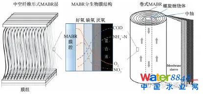YEH 和 JENKINS等于 1978 年首次提出并構(gòu)建了MABR,用聚四氟乙烯纖維膜供氧處理人工合成污水取得很好的效果。Côté P等人1989 年提出無(wú)泡曝氣(Bubble free aeration)的概念,論證了MABR在氣體高效傳質(zhì)方面的優(yōu)勢(shì)。YAMIGAWA等在1994年證實(shí)MABR微生物膜的功能分層結(jié)構(gòu), 其研究結(jié)果表明, 硝化菌群主要聚集在靠近載體膜表面氧分壓高的附近, 而反硝化菌群主要聚集在生物膜與液相主體界面缺氧區(qū)域,這種特殊的分層結(jié)構(gòu)使MABR具有同時(shí)除碳脫氮的效果。MABR工藝主要有中空纖維和卷式膜兩種形式,主要技術(shù)優(yōu)勢(shì)是無(wú)泡曝氣帶來(lái)的低能耗;與此同時(shí),MABR獨(dú)特的透氣膜曝氣-生物膜的結(jié)構(gòu)創(chuàng)造了一個(gè)氧氣與溶解性底物在生物膜厚度上的“逆向擴(kuò)散”(counter-diffusional biofilm),這樣硝態(tài)氮與污水中碳源在最外層生物膜直接接觸,實(shí)現(xiàn)外層生物膜低碳源損耗的高效同步硝化反硝化(SND)脫氮(見(jiàn)圖6),MABR氧傳遞效率可以達(dá)到傳統(tǒng)微孔曝氣方式的4倍。