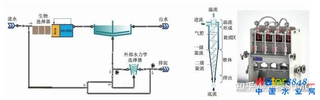 基于間歇流AGS工藝的一些不足,近些年來(lái),連續(xù)流污泥顆;に嚰翱刂坪蛯(shí)現(xiàn)手段相關(guān)研究與應(yīng)用得到重視,尤其是近五年來(lái),基于連續(xù)流工藝的致密活性污泥(Densified Activated Sludge, DAS)工藝在美國(guó)多個(gè)項(xiàng)目進(jìn)行大規(guī)模生產(chǎn)性試驗(yàn)研究并得到示范應(yīng)用,證明了連續(xù)流AGS & DAS技術(shù)的優(yōu)越性,尤其是與高級(jí)生化過(guò)程控制系統(tǒng)的結(jié)合。連續(xù)流AGS & DAS主要技術(shù)手段是采用生化動(dòng)力學(xué)生物選擇器及水力選擇器組合形式,來(lái)篩選高密度重質(zhì)顆;勰。具體而言,通過(guò)基于微生物生化代謝動(dòng)力學(xué)的“快食-饑餓”(feast/famine)兩段式生化反應(yīng)條件控制,并采用在線(混合液線)或離線(污泥回流線)水力學(xué)分離器以篩選密度大、沉速快的顆粒污泥,輕質(zhì)污泥通過(guò)水力分離器上部溢流部件以剩余污泥形式撇除系統(tǒng)之外,加裝水力旋流器后的活性污泥生化系統(tǒng),SVI可以顯著改善,提升二沉池的泥水分離效果,處理能力因而可以得到同步提升,DAS工藝原理示意見(jiàn)圖9。