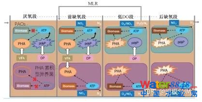 傳統(tǒng)構(gòu)型活性污泥工藝如AAO,由于設(shè)計(jì)參數(shù)與實(shí)際情況(水量、水質(zhì))可能出現(xiàn)的偏離、以及運(yùn)行過(guò)程各工藝段固定池容的“物理剛性”約束,運(yùn)行過(guò)程不能根據(jù)進(jìn)水水質(zhì)特性進(jìn)行實(shí)時(shí)調(diào)整各工藝段,大量的碳源被好氧過(guò)程過(guò)度消耗,導(dǎo)致進(jìn)水用于反硝化過(guò)程的碳源利用率實(shí)則較低。傳統(tǒng)的工藝設(shè)計(jì)構(gòu)型和運(yùn)行過(guò)程控制有利于PHA在PAOs和GAOs中的積累,卻嚴(yán)重限制和削弱了DPAOs和DGAOs這類(lèi)功能菌的PHA驅(qū)動(dòng)型反硝化(PHA-Driven Denitrification)潛力,理想的反硝化過(guò)程設(shè)計(jì)應(yīng)考慮到不同生態(tài)和代謝特征微生物在胞內(nèi)碳源的形成和高效利用優(yōu)勢(shì)和差異,圖7顯示了低DO操作下PAH驅(qū)動(dòng)脫氮工藝設(shè)計(jì)的概念框架。
