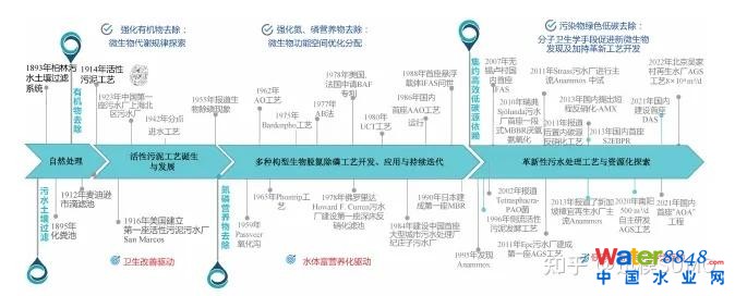 回顧污水處理工藝技術(shù)的百余年發(fā)展歷史,隨著對(duì)環(huán)境問(wèn)題的認(rèn)知轉(zhuǎn)變,污水處理也逐漸實(shí)現(xiàn)了從最初的城鎮(zhèn)衛(wèi)生工程向環(huán)境工程及環(huán)境水質(zhì)學(xué)方向的轉(zhuǎn)變?傮w可大致劃分為四個(gè)階段:活性污泥工藝誕生之前采用土壤過(guò)濾或滴濾池工藝階段、活性污泥發(fā)展初期以耗氧有機(jī)物為去除目標(biāo)階段、延續(xù)至今的污水生物除磷脫氮技術(shù)快速發(fā)展各種經(jīng)典活性污泥工藝百花齊放階段,以及近十年來(lái)以綠色低碳、高效集約為基本特征的革新性污水生化處理工藝持續(xù)開(kāi)發(fā)與應(yīng)用階段,不同技術(shù)發(fā)展階段標(biāo)志性處理工藝發(fā)明或提出,及國(guó)內(nèi)外污水處理一些重要里程碑式事件按時(shí)間軸展示于圖1。