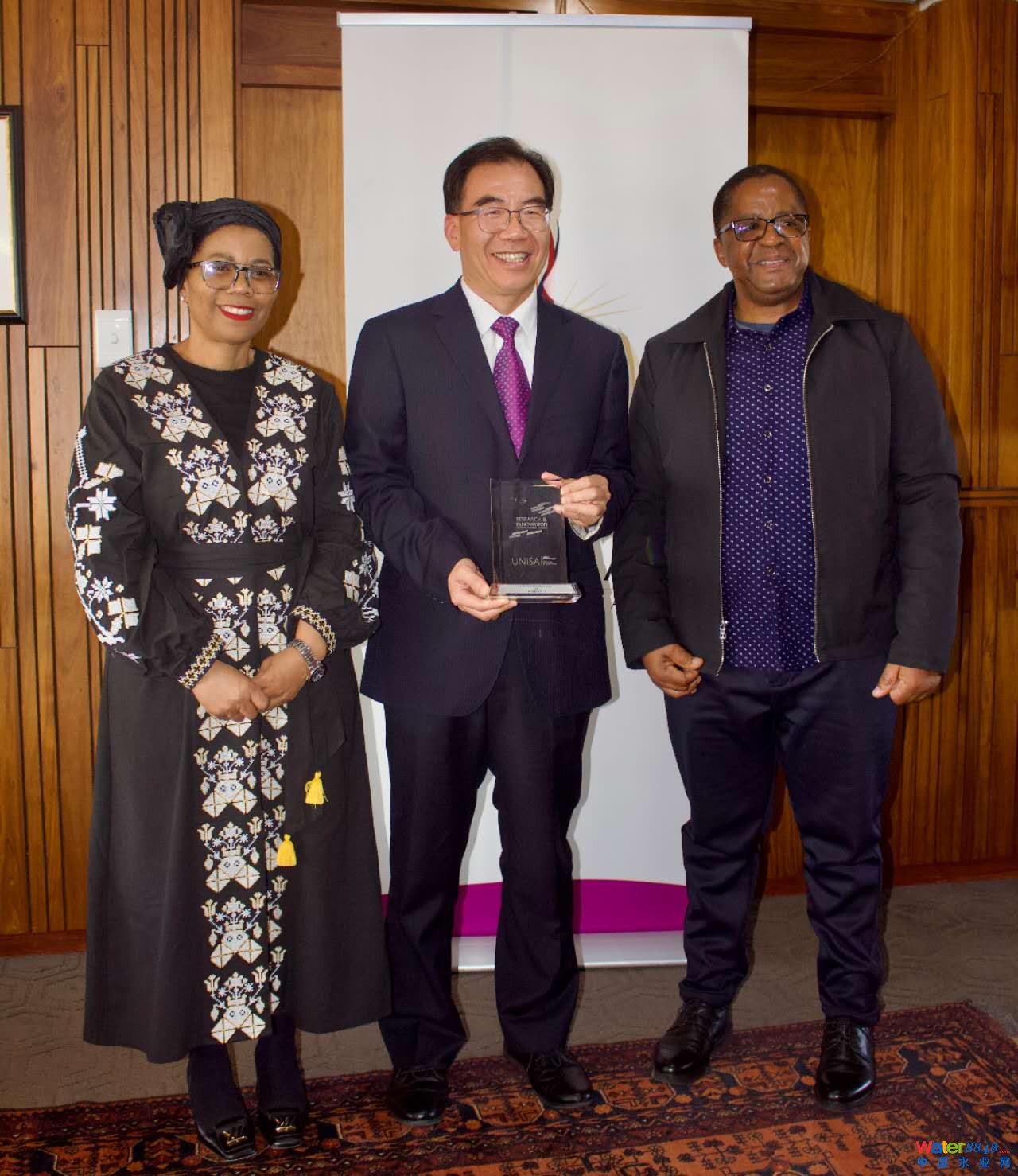 南非大學(xué)普倫·倫卡布拉教授和南非大學(xué)工程與技術(shù)學(xué)院院長貝基·曼巴教授為李建新客座教授頒發(fā)2024年度南非國家自然基金委國際學(xué)者認(rèn)證和年度研究與創(chuàng)新獎合影(20246月)